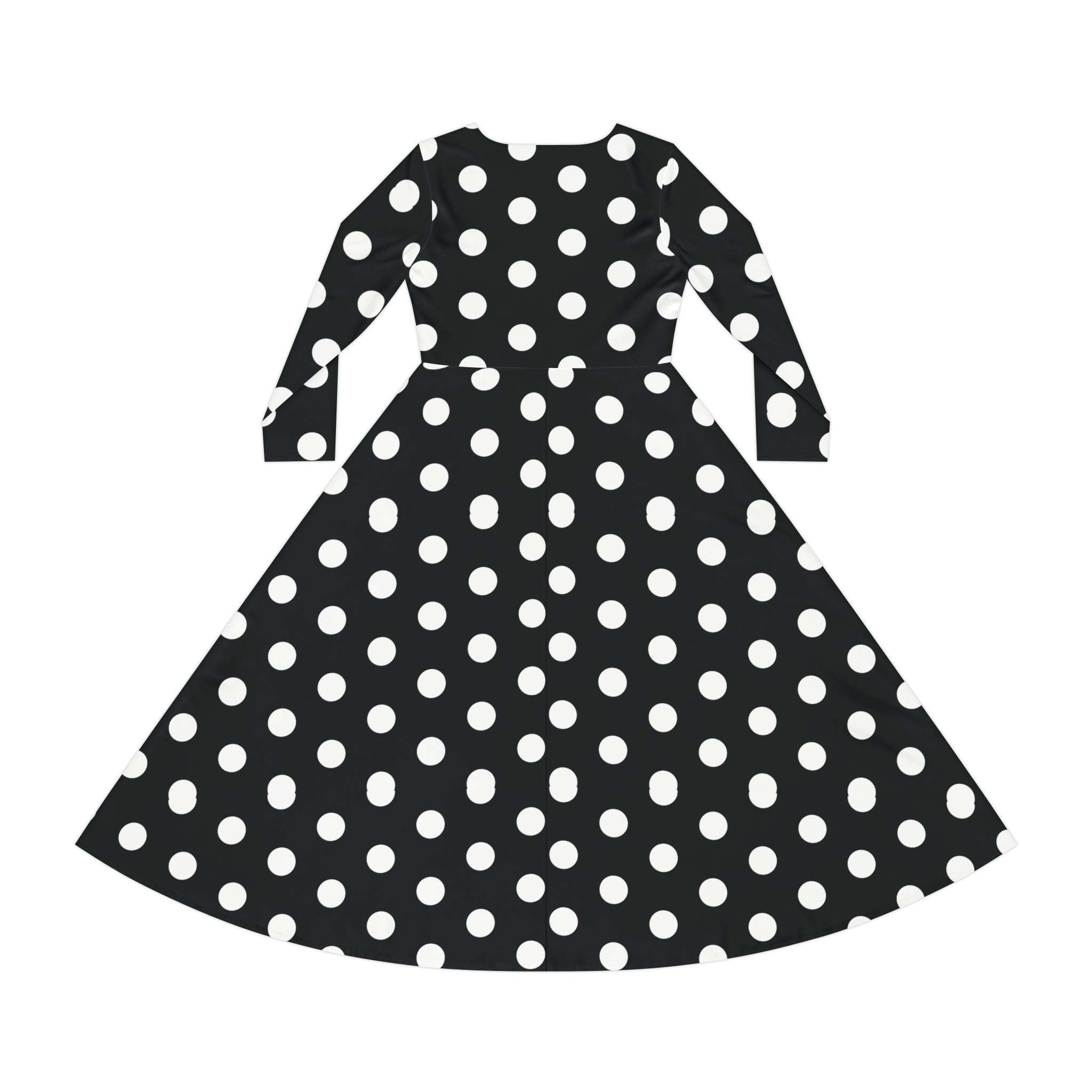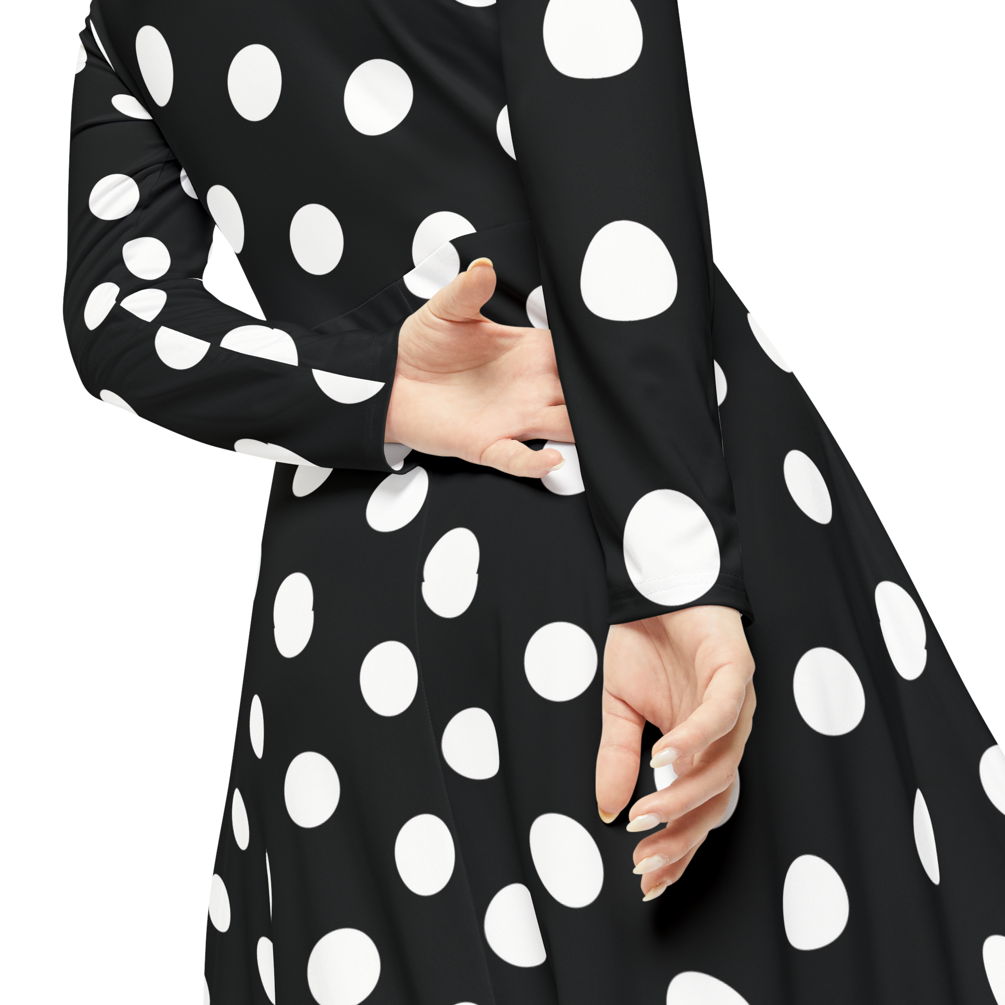 エレガントな水玉柄が印象的な長袖ダンスドレスです。ストレッチ性に優れた全面プリント素材で、動きやすさと美しいシルエットを両立しています。