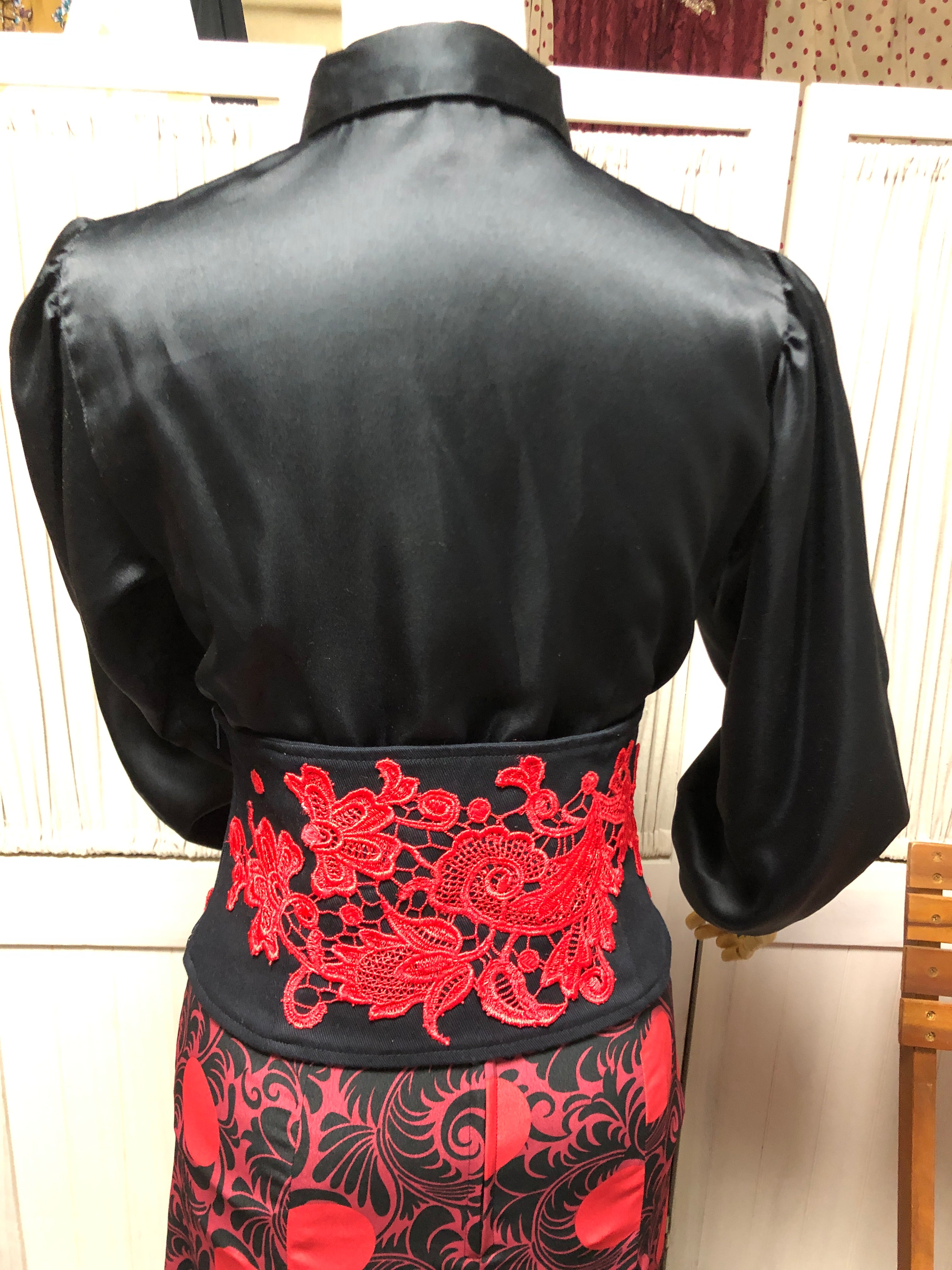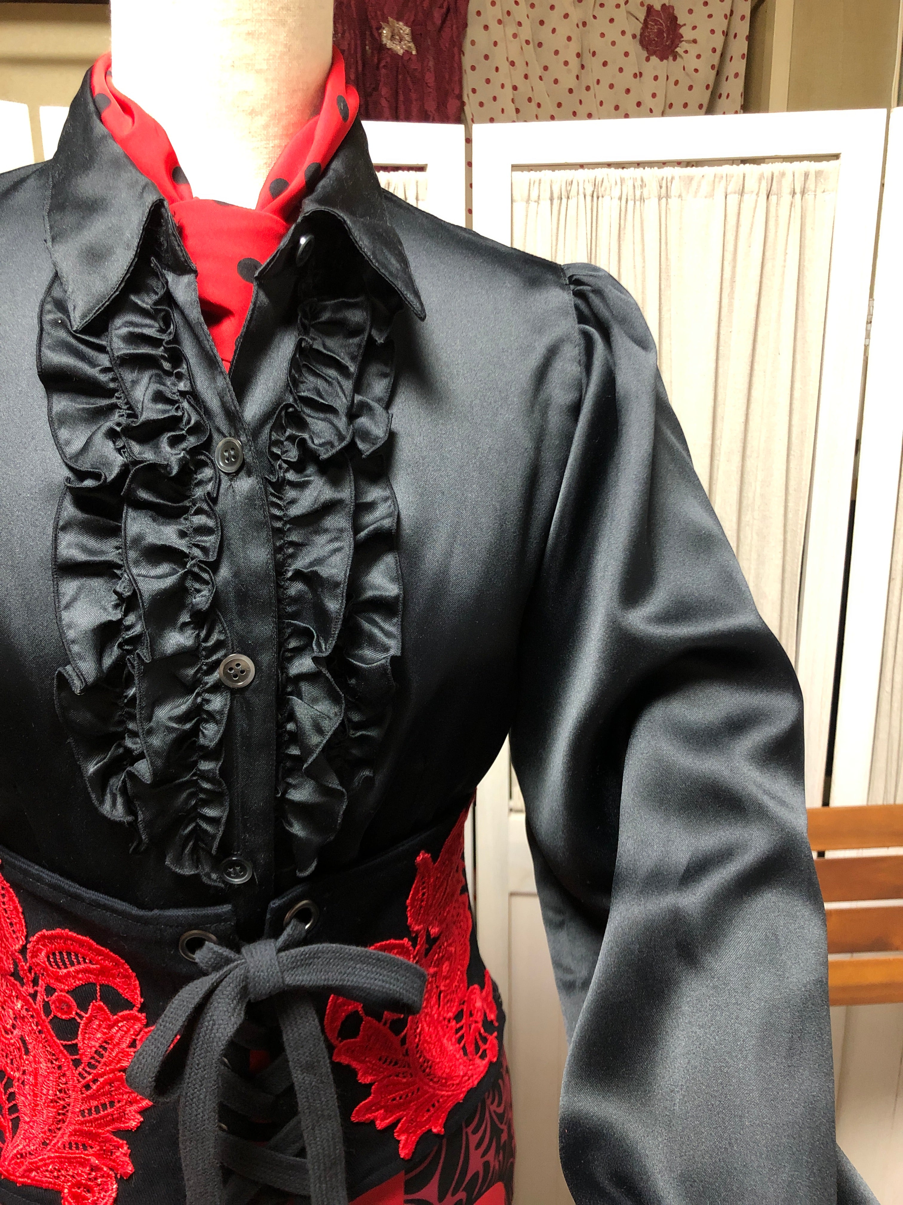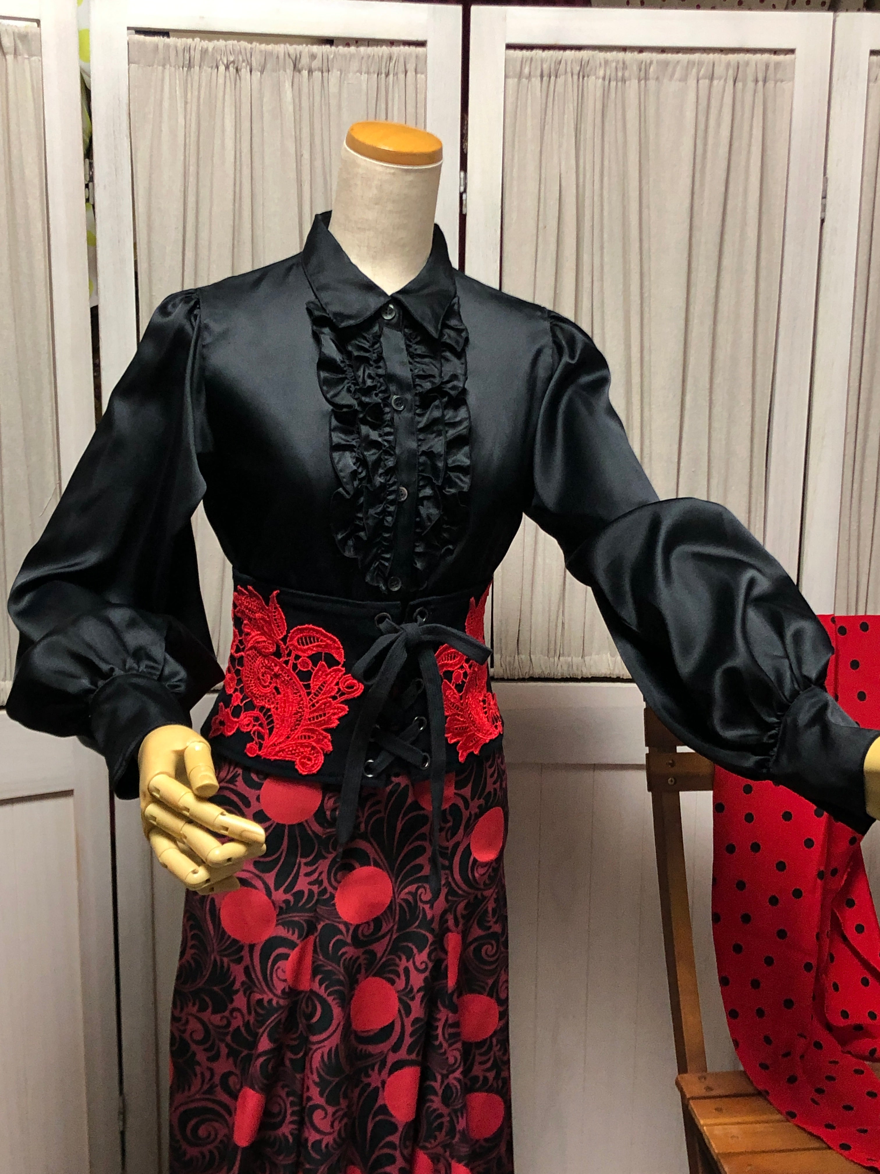 フラメンコ トップス陰影の美しい ブラック サテン・シャツ ブラウス